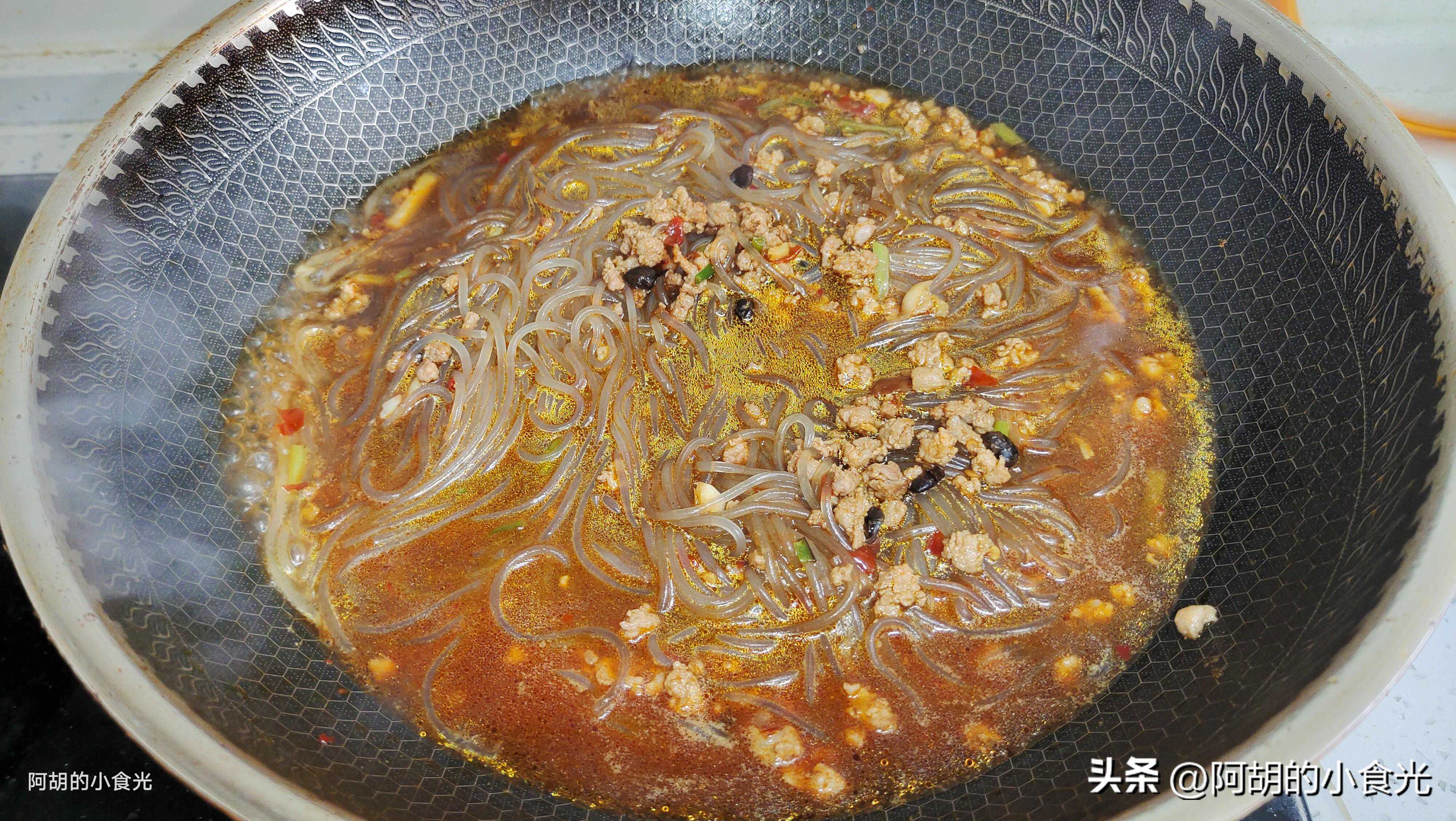 第四步:往锅内加入适量的开水,大火煮开后加入少许食盐(豆瓣酱较咸,加盐要小心)、鸡精和老抽来调味调色,再将泡软的粉条下锅,翻拌均匀后开中小火焖煮个三五分钟左右。若感觉颜色不够的,此时可以补添一些老抽。
