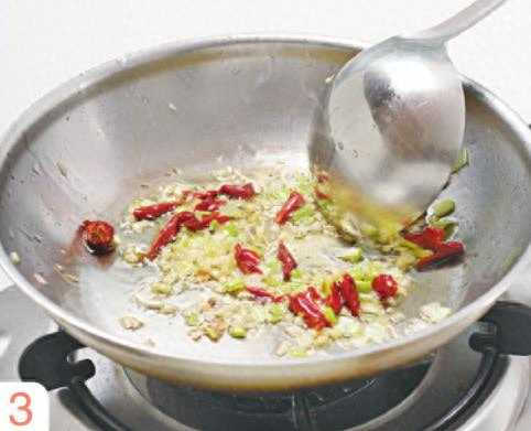 3净锅上火,倒入色拉油烧热,下干红椒、葱姜蒜末炒香。