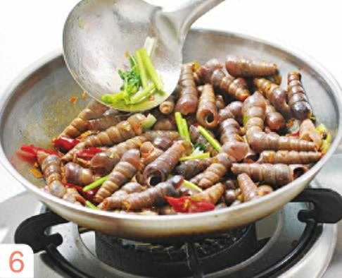 4炒锅内烹入酱油,下入丁螺煸炒1分钟。