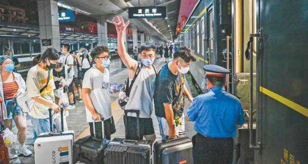 当日20时,在工作人员的有序引导下,旅客们提着大包小包陆续进站。在候车大厅,记者看到大厅内几乎坐满了人。重庆车站车间党总支书记钱崇纹说,平时这趟车售票在四五百人左右,当天卖出近1000张票,十分火爆。
