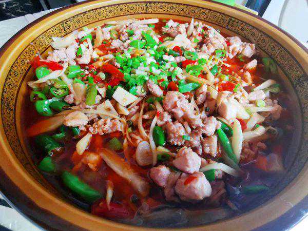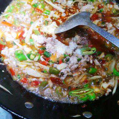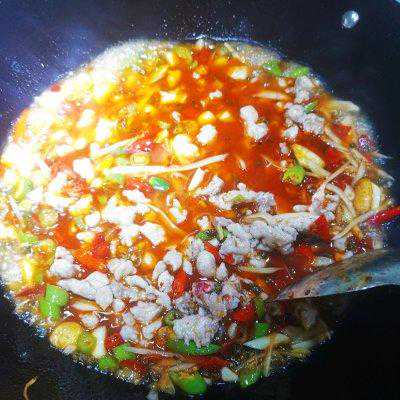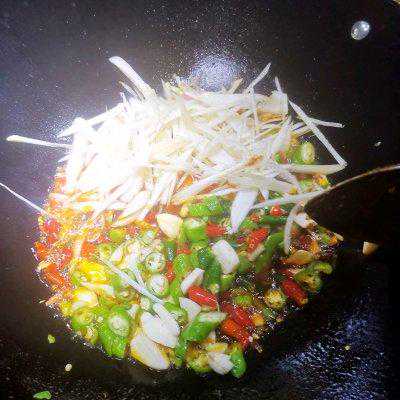 10、下入一半的子姜,青红椒,小米辣,留一半等会儿起锅前再放