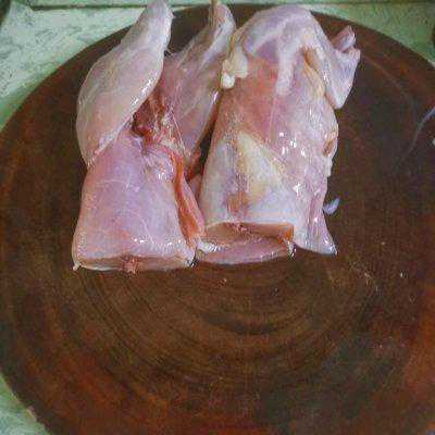 1、选择仔兔儿,三斤左右最好,宰好后清洗血水,沥干备用
