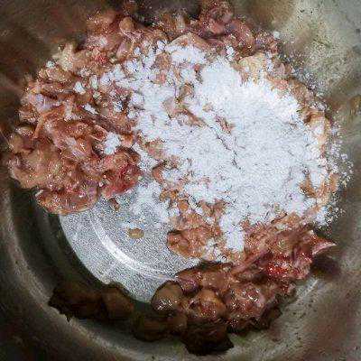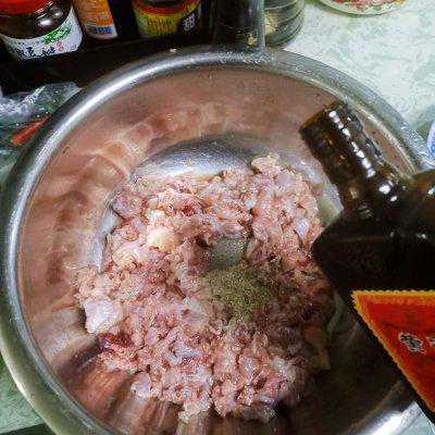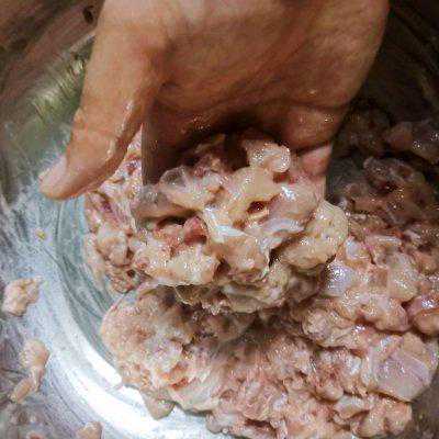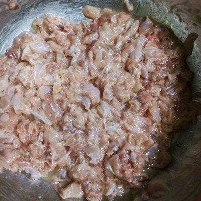 2、宰得越小越好,加入黄酒,胡椒,少于盐,白糖用手抓匀