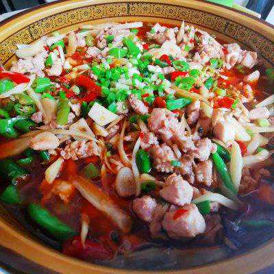 12、下过油后的兔丁和剩余子姜青红椒,小米辣,加胡椒粉,盐,鸡精,白糖,香醋,适当翻炒调味