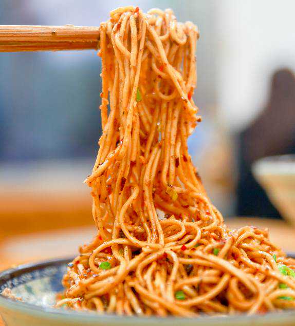 燃面是干拌面,油重无水,点火便会燃烧,所以取名为燃面,拌上红剁椒和辣椒油,辣味后劲十足,也实在让人非常燃!