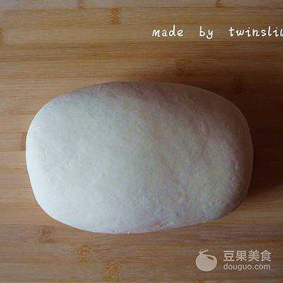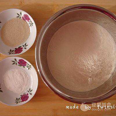 2、将酵母、泡打粉倒入面粉,搅拌均匀,用温水和成面团,盖上湿润的屉布,温暖处进行发酵。