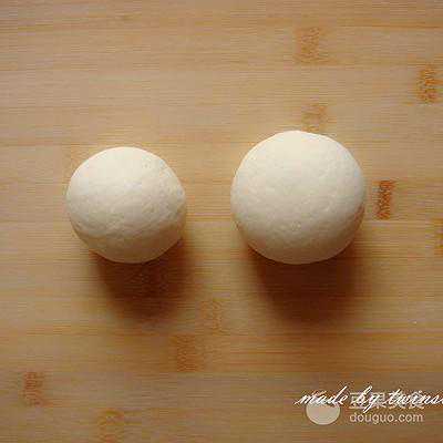 3、待面团发酵至原来的1.5至2倍大时就可以下剂子了。剂子的大小按个人喜好。将一份剂子分成两份,其中一份稍大一些,用于做小螃蟹的主体;另一份稍小,用于做小螃蟹的爪子。