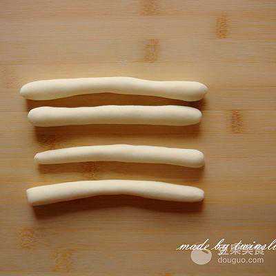 5、将做小螃蟹爪子的面团分成四份,搓成长条。其中一条比另三条稍粗一些,用来做大蟹钳。
