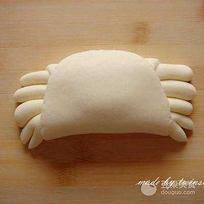 7、将面片向上折,包裹住螃蟹的爪子,靠近自己的这端压在上面。