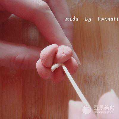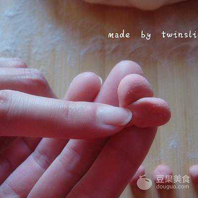 10、如果想更美观,还可以做朵小花做点缀。取一块原色面团,搓入少许红曲粉,揉成粉色面团,把粉色面团捏成颗颗小球,这是花朵花瓣的雏形。