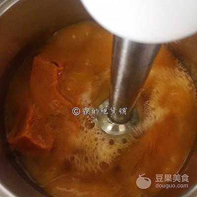2、锅里放350g的水,随后把蒸熟去皮的南瓜倒入