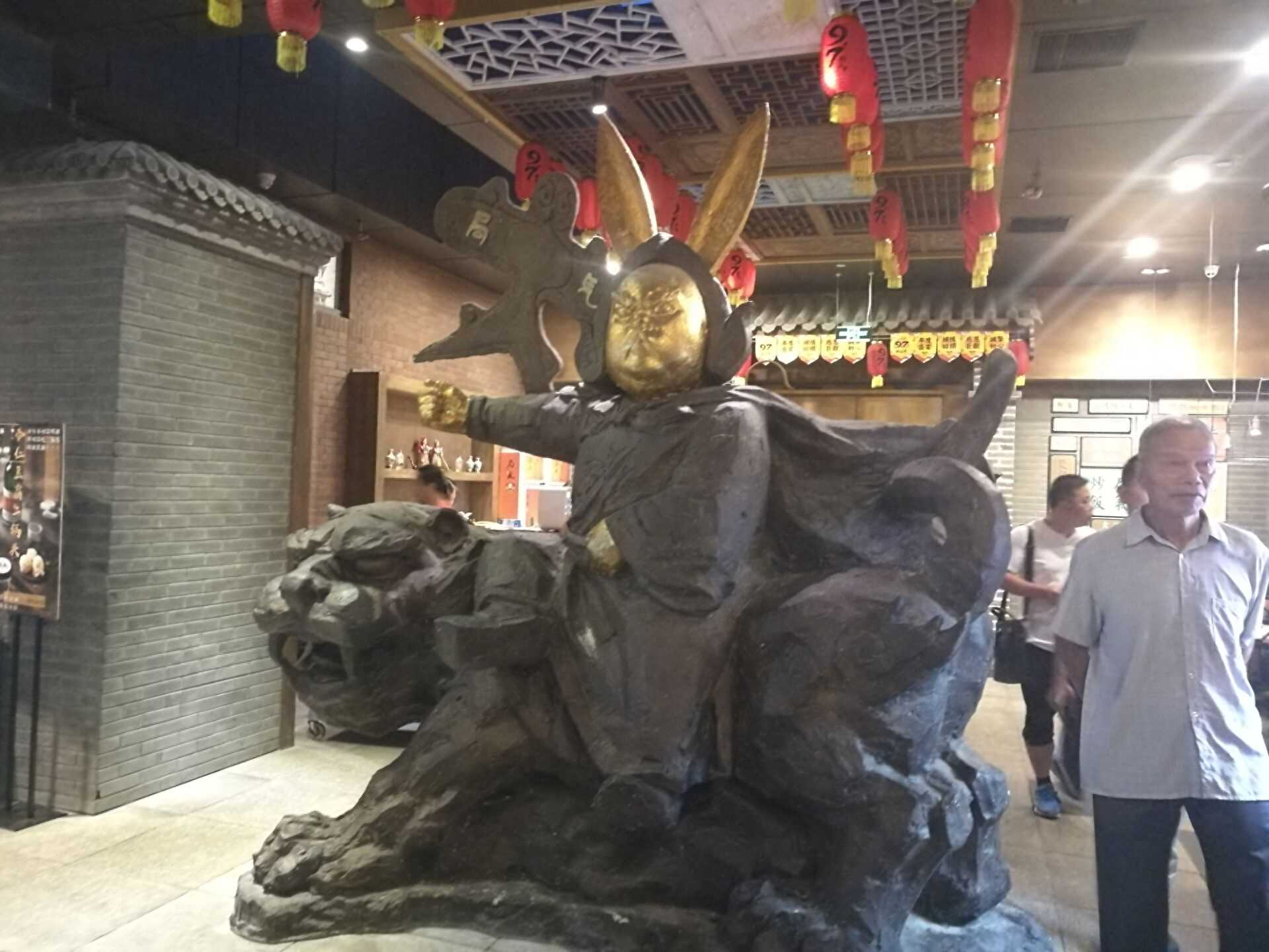 屋里屏风后“兔爷”造型。北京兔爷是封神演义中的长耳定光仙,它渊源于古老的月亮崇拜。明清以来,月宫玉兔逐渐从月崇拜的附属物中分离出来,在祭月仪式中形成了独立的形象,并逐渐丰富。兔儿爷兼具神圣和世俗的品性,融祭祀和游乐的功能于一体。如今兔儿爷已经成为最具代表性的北京非物质文化遗产之一。兔爷是泥做的,兔首人身,披甲胄,插护背旗,脸贴金泥,身施彩绘,或坐或立,或捣杵。