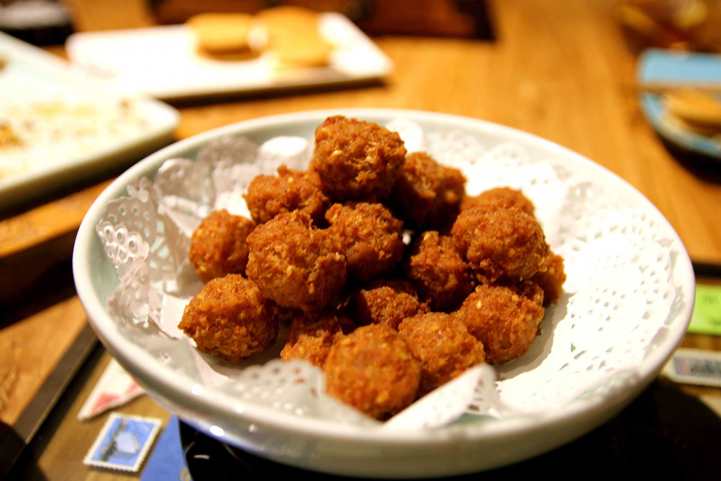 干炸丸子。我个人觉得这道推荐菜味道倒是真一般,丸子吸油很严重,感觉有点炸过了,肉馅也一般,不是很香。等到冷下来甚至有点咯牙。大鸭梨的干炸丸子都比这个要好吃很多。