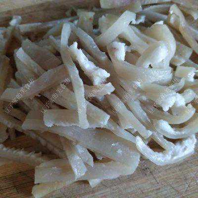 1、煮熟的猪肉皮,看看是否有猪毛,刮一下拔下猪毛。这是每次买猪肉代的猪皮攒二次就够了。熟猪皮切成丝,不是太细,可以说是细条了啊。