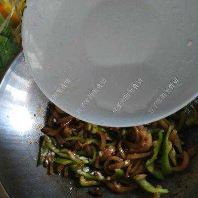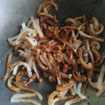 4、翻炒一下猪皮,加料酒和生抽翻炒猪皮,在加老抽上色了。猪皮有胶质很爱粘锅,需大火快速翻炒。