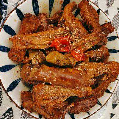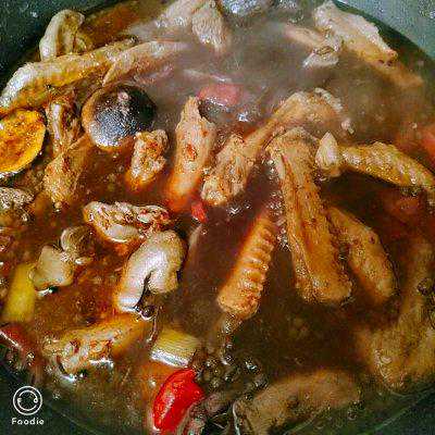 3、锅里多放油,冰糖炒糖色,放入鸭货,翻炒。所有调料放入,倒入开水。