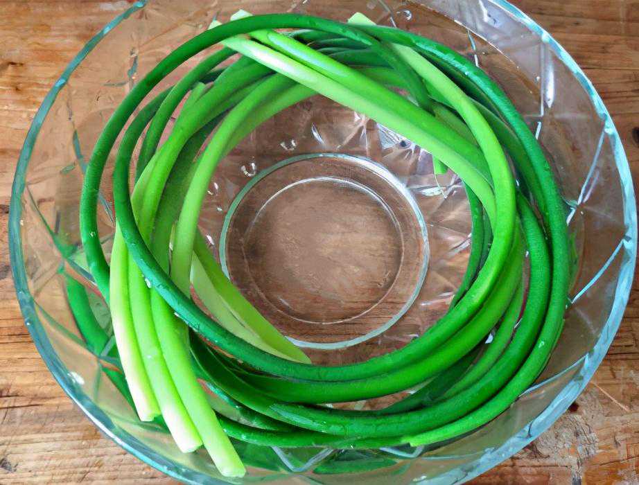 第二步,焯下水,煮2分钟的时间,便可将蒜苔从锅中捞出来,快速放入在事先准备好的凉水中浸泡,一冷一热,将蒜苔快速降温,蒜苔变凉后;
