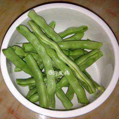 3、先把四季豆洗干净,去两头,把筋撕掉,撕短成二截,然后再洗干净,沥干水份。