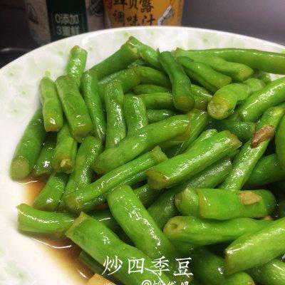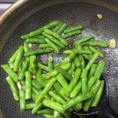 7、放入四季豆,稍炒片刻,倒入适量清水,盖上锅盖