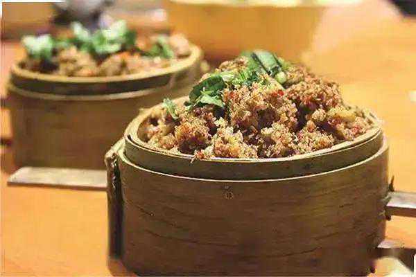 牛肉蒸好后要达到香嫩滋润、鲜香麻辣、柔糯爽口、无筋感和木质感,且略带回甜的效果,首先牛肉要专选以“抱丹”肉(肋条上的牛肉)最难,米粉要选晚稻米,经炒制加三奈、八角、花椒等香料适量磨成二粗米粉,香料不能多,多了味过浓,也不能少,少了无香味。米粉也不能太细,过细蒸来不散籽爽口,粗了难吃,码味用豆瓣酱要先制辣酱炒香后方能使用。其蒸法也很另类,在锅上扣一个木盆,木盆底在上,反扣在锅上,盆底有一个2CM的孔;锅装满水,待水沸后,蒸汽集中从盆孔喷出,小竹笼就放在小孔上,只需15-20分钟。粉蒸牛肉就蒸好,此时连竹笼一起放在盘中,放上香菜、香葱花、味精,滴几滴香油并同时配辣椒面、花椒面碟子一同上桌,吃的麻辣的人可自由添加增味。