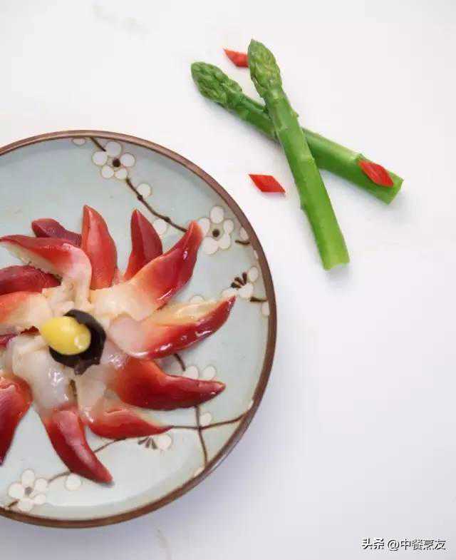 2.捞出后再放入冰水中过凉,摆盘,点缀芦笋和白果。