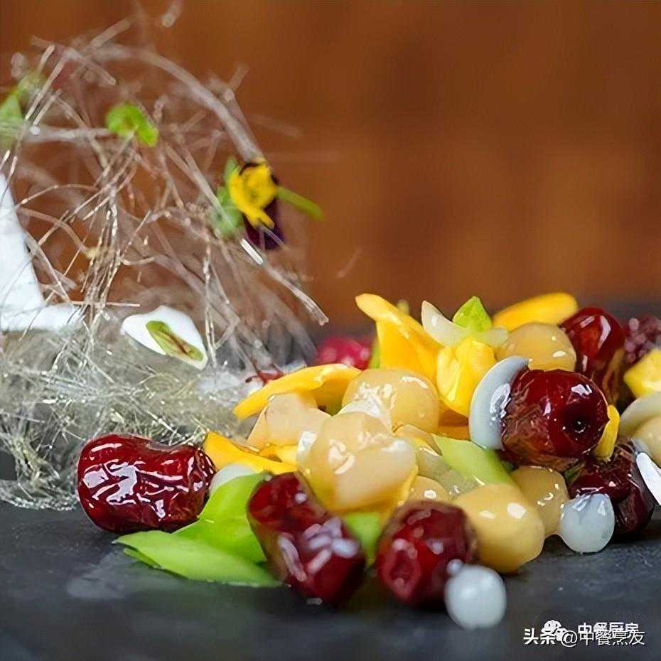 2把糯心红枣在五成热的油温里炸熟,其它辅料飞水加入盐4克,除了树菠萝不用飞水;