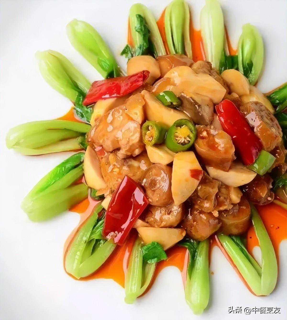 5.将煨好的猪尾定碗装盘,再浇上收浓的料水,围摆上汆断生的小白菜心,即可。
