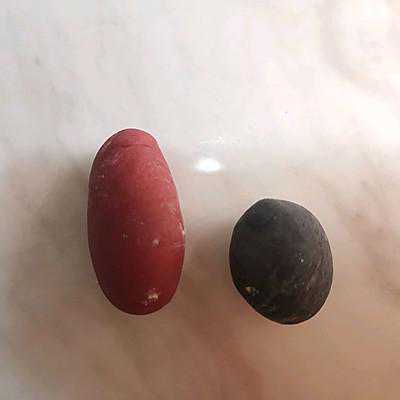 10、拿两个白面团分别加入红曲粉和竹炭粉,分别揉成红面团和黑面团