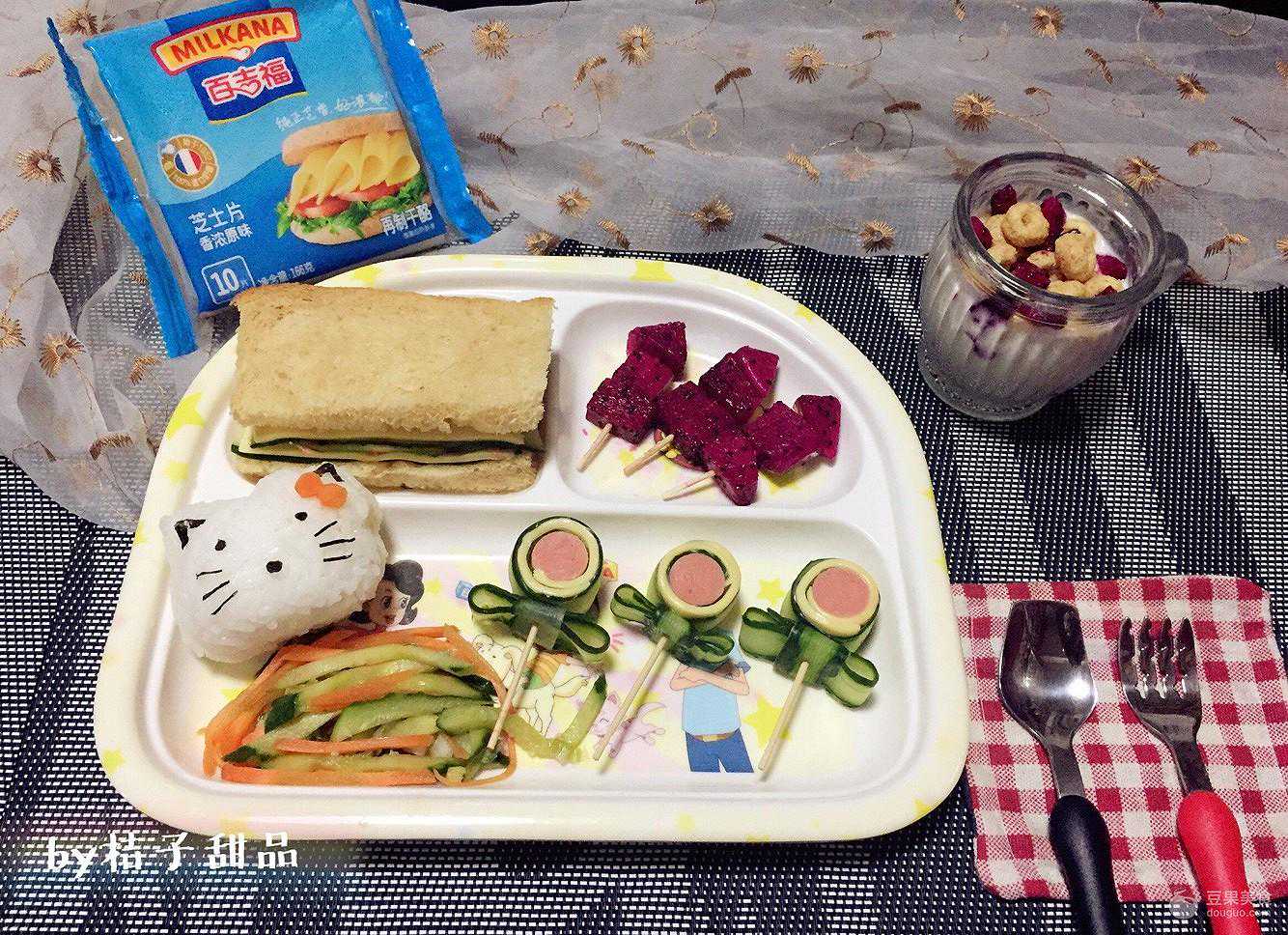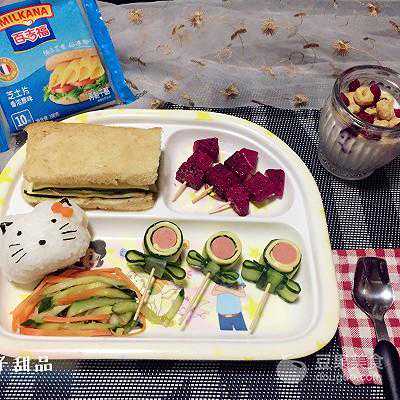 小贴士1、米饭造型和配菜,可以随意发挥啦。2、黄瓜卷里的芝士,可以换成薄薄的蛋饼,同样高颜值。3、这款便当里的三明治是最简单的版本,亲们可以根据个人喜好添加各种蔬菜和肉类。