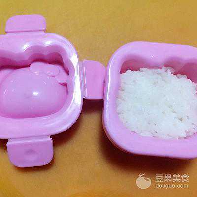 1、米饭放在模具里,用力压实,再脱模,做出卡通饭团。