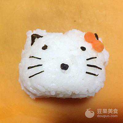 2、海苔剪出猫咪的眼睛鼻子,耳朵,胡须,用胡萝卜或者火腿肠切片做蝴蝶结。