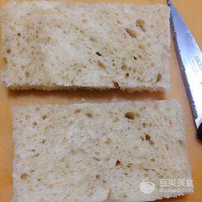 3、吐司片切成两个长方形。吐司用自己做的或者买现成的都可以。我这个是自己做的红糖吐司,面包机做滴,很软很好吃(配方和做法下次单独发食谱吧)。