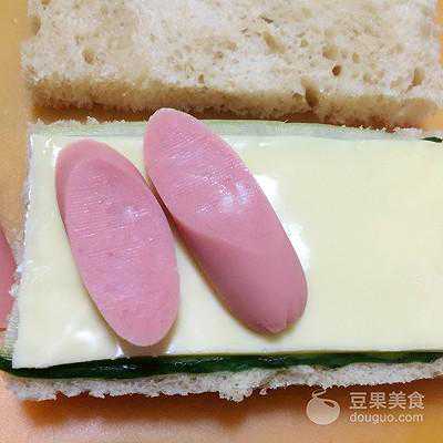 5、铺上黄瓜片、芝士片、火腿肠。可以根据个人口味挤点番茄酱,放上生菜或者番茄、煎蛋、火腿片什么的。