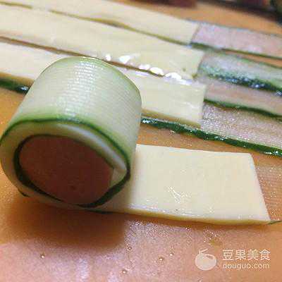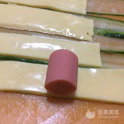 8、黄瓜洗净,用水果刨切出薄薄的长条。(直接用刀切也可以,但是粗细厚薄不太好控制)。在黄瓜片上放上切好同样宽度的芝士片和火腿肠,卷起来。