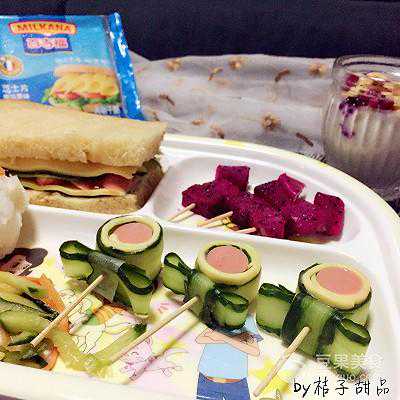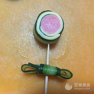 7、下面做几个芝士火腿肠黄瓜卷。我做了个棒棒糖的样子,宝宝很喜欢。具体做法我有另外发食谱,这里就简单介绍一下。