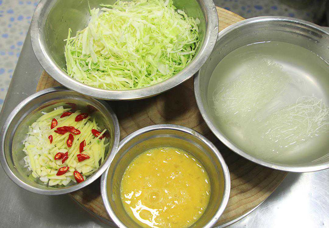 粉丝包菜炒鸡蛋1.准备包菜半颗,去掉根部切成细丝,放入盆中;碗中打入2个鸡蛋,加入食盐1克,用筷子搅拌成鸡蛋液;粉丝一把放入盆中,加入温水浸泡10分钟,再切点葱花、蒜片、姜丝、小米椒圈备用。