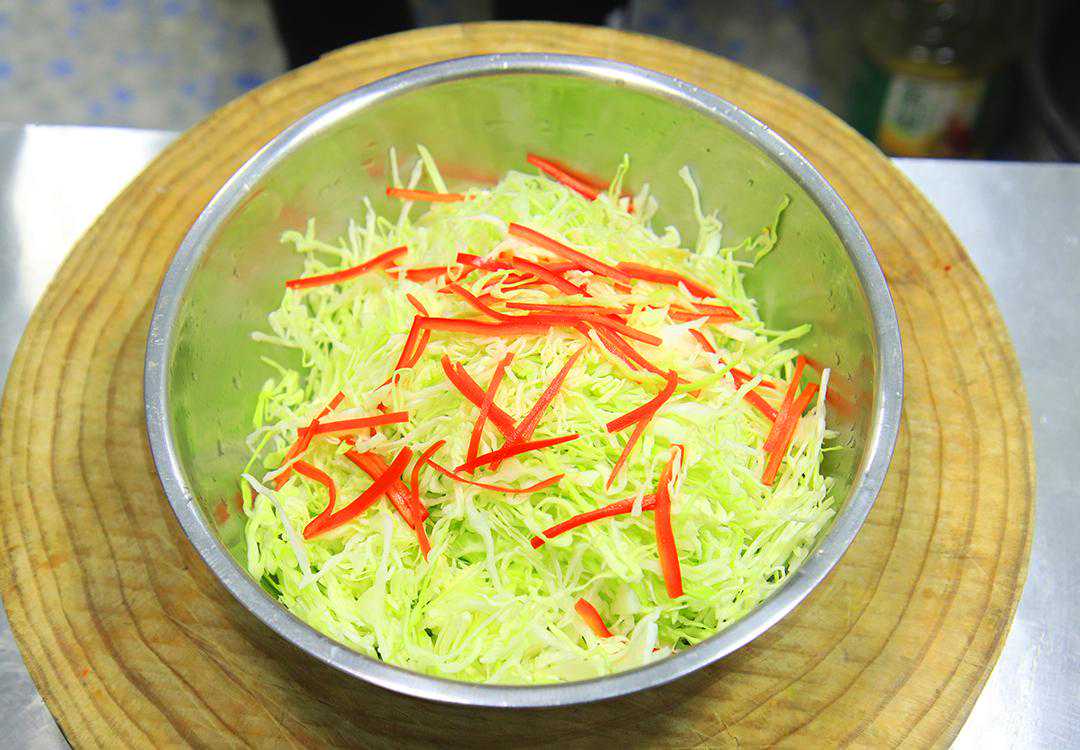 1.首先,准备洗净的包菜半颗切成细丝,再切得短一些,这样更容易烙熟。