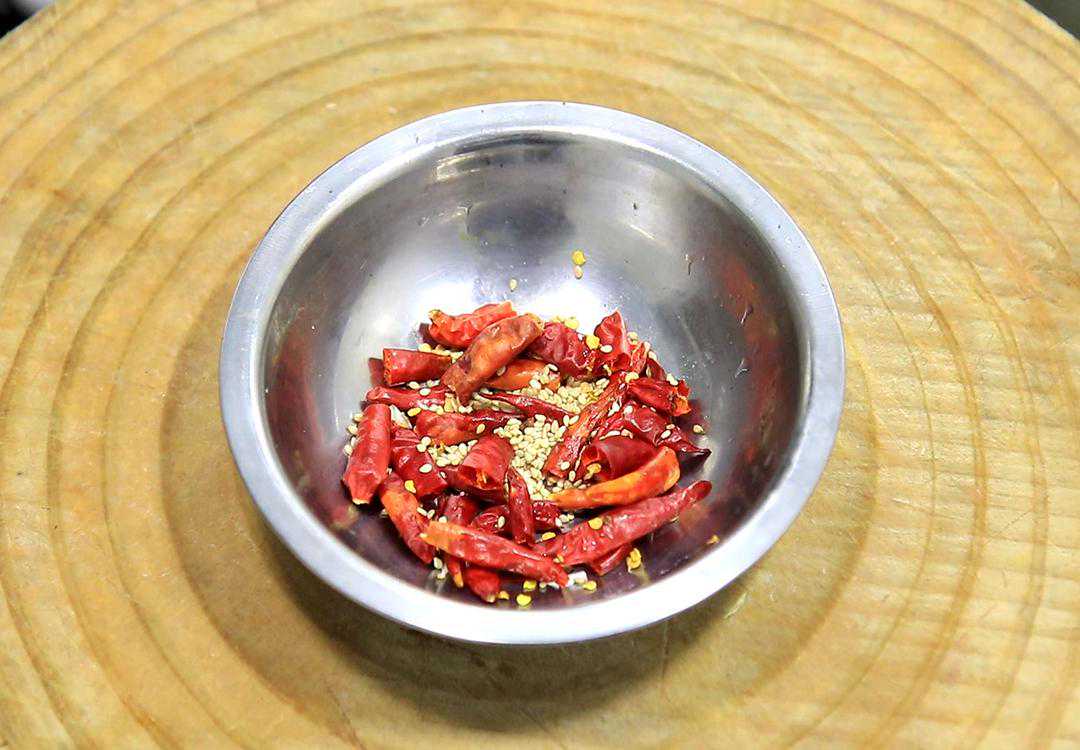 2.盆中放入一小把干辣椒,一勺白芝麻备用,不喜欢吃辣的朋友,干辣椒可以少放一点。