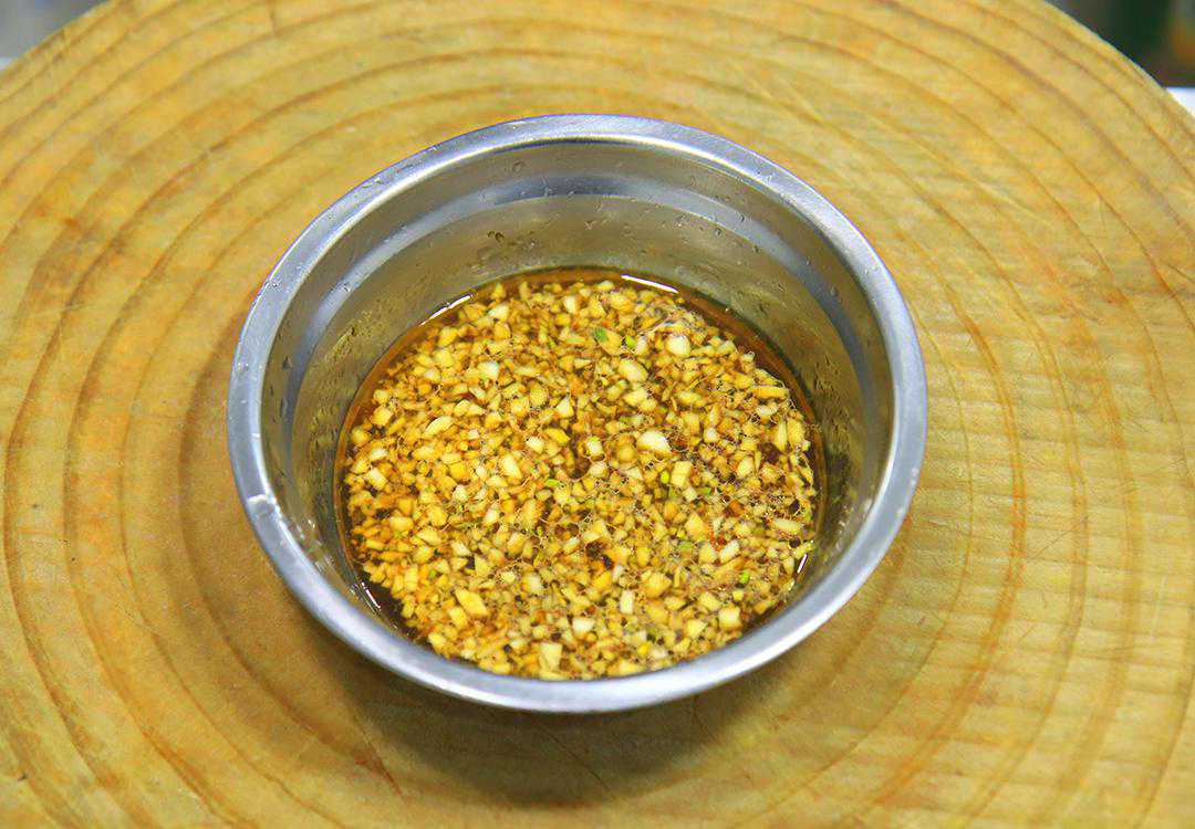 3.准备大蒜一小把,切成蒜末放入盆中,加入陈醋10克,香油5克,鸡粉2克,食盐2克,白糖3克,再加入蒸鱼豉油10克,用少许温开水化开,料汁就调好了。