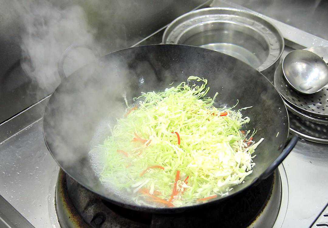 3.锅内再次烧油,油热以后倒入葱姜蒜片、小米椒炒出香味,倒入包菜丝用大火快速翻炒,翻炒2分钟左右,翻炒至包菜丝断生倒入粉丝,淋入一点明油继续翻炒。