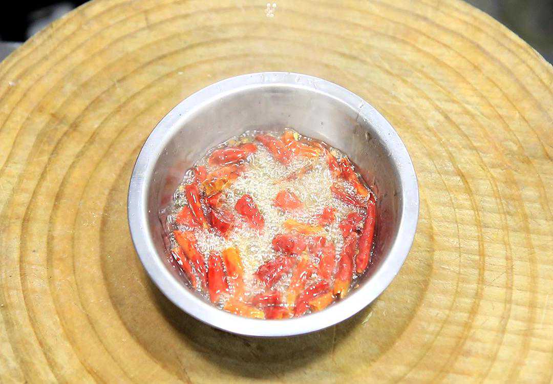 5.锅内加入植物油20克,油温烧到七成热时起锅,把热油浇在干辣椒上,爆出料头的香辣味。