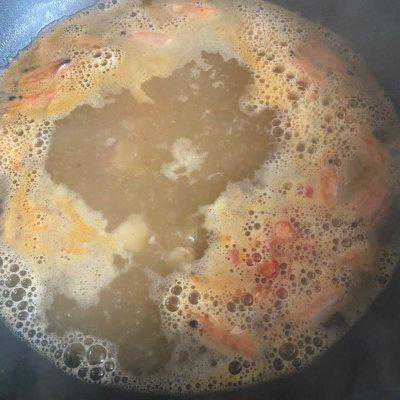 3、炒香之后倒入高汤或清水,放入冬阴功酱,香茅,小米辣,番茄炖煮