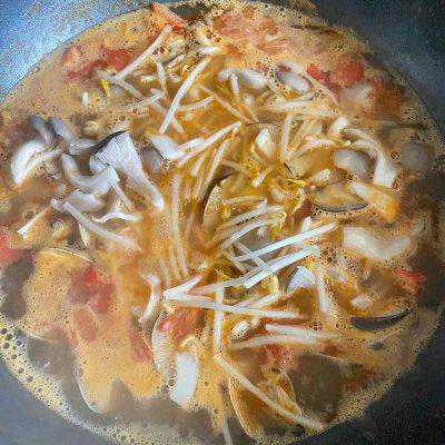 4、放入虾,花蛤,菇,豆芽等继续炖煮
