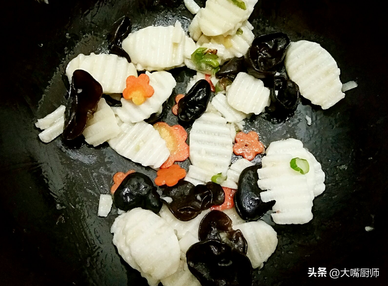 2、开水里再加入一勺盐,放入胡萝卜片、木耳,煮2分钟捞出沥干水分。起锅烧油,六成热时放入葱花爆香,倒入木耳、胡萝卜片,大火翻炒2分钟。