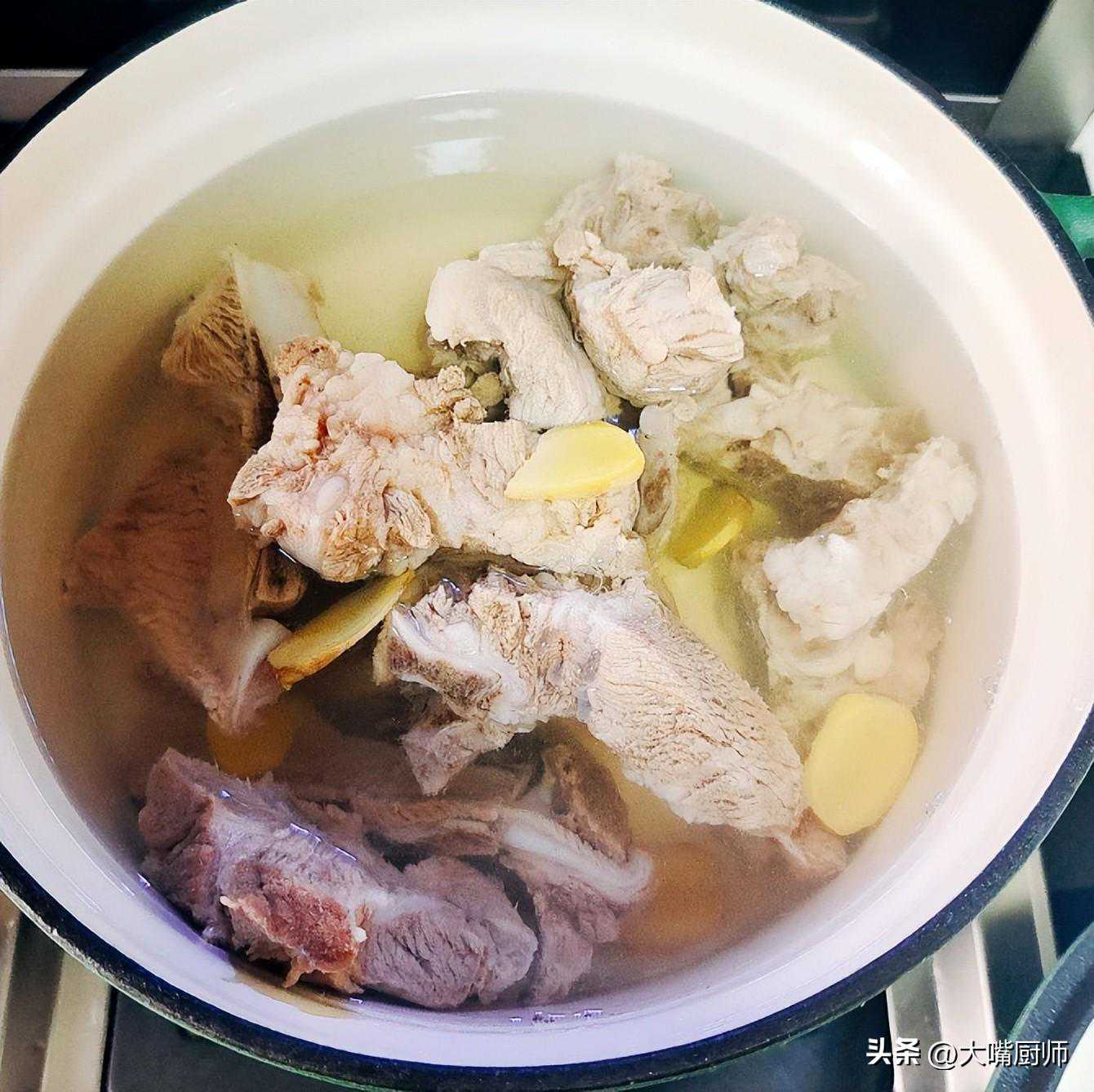 1、排骨洗干净,剁成小块,用清水浸泡1小时,泡出血水后放入锅中,加入适量冷水,放入葱段、姜片、料酒,大火煮5分钟,用勺子撇掉浮沫,捞出冲洗干净。