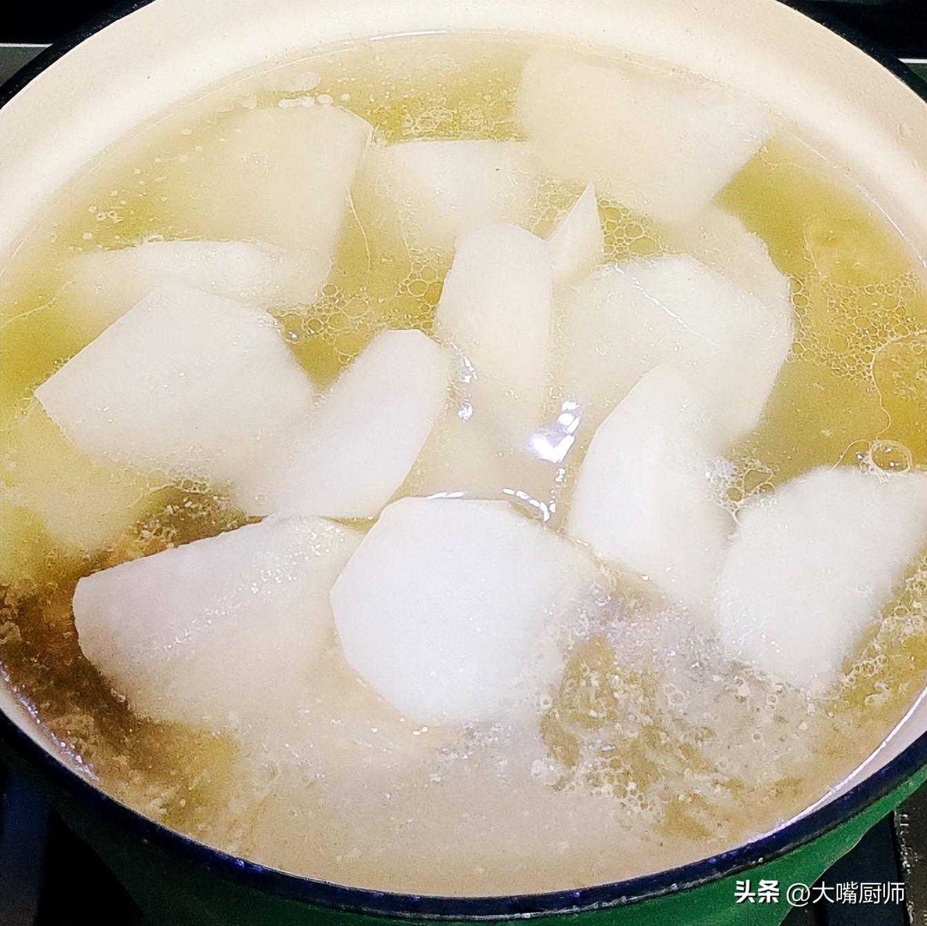 3、白萝卜去皮,洗干净后切成滚刀块,放入排骨锅中,加适量盐调味,继续炖20分钟,出锅前加入鸡精、白胡椒粉,即可盛出,撒上葱花点缀。