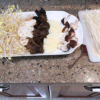 2、焯水时,冷水加盐,搅拌化开,依次分批焯水(以断生为主,分别2~4分钟不等。莲菜片最短1分钟,黑木耳和黄豆芽可以一起下锅3分钟,土豆片2分钟、最后菌类4分钟)