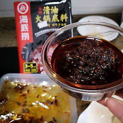 3、1~2人份:1/2包海底捞酱料(为了不使油和酱分离,提前倒入一个小碗,多余部分只要表面有油封着,留下次用不会坏)