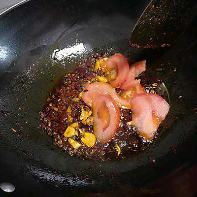 7、1.加入酱料翻炒香2.加入番茄翻炒(切大块,番茄增加口感)
