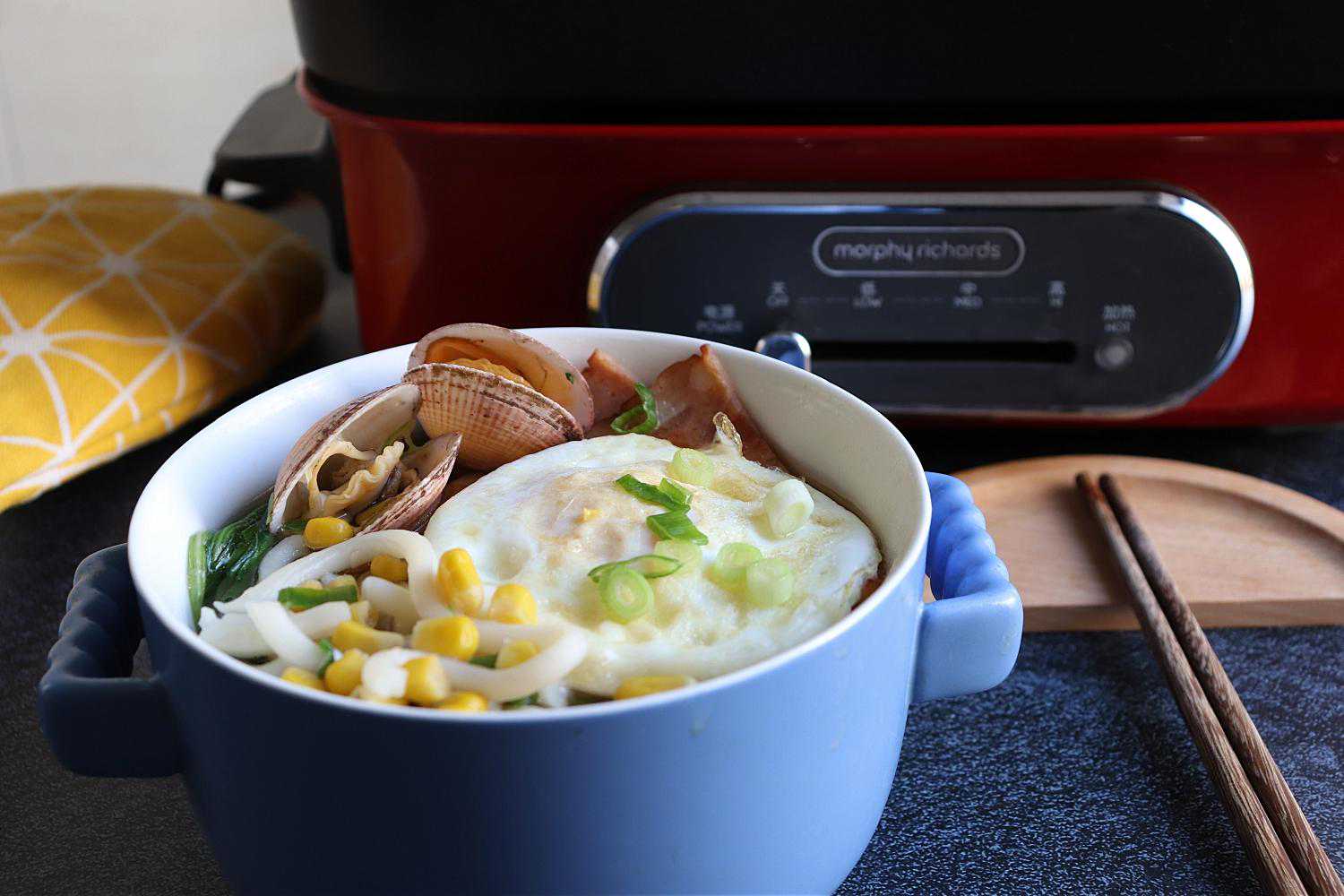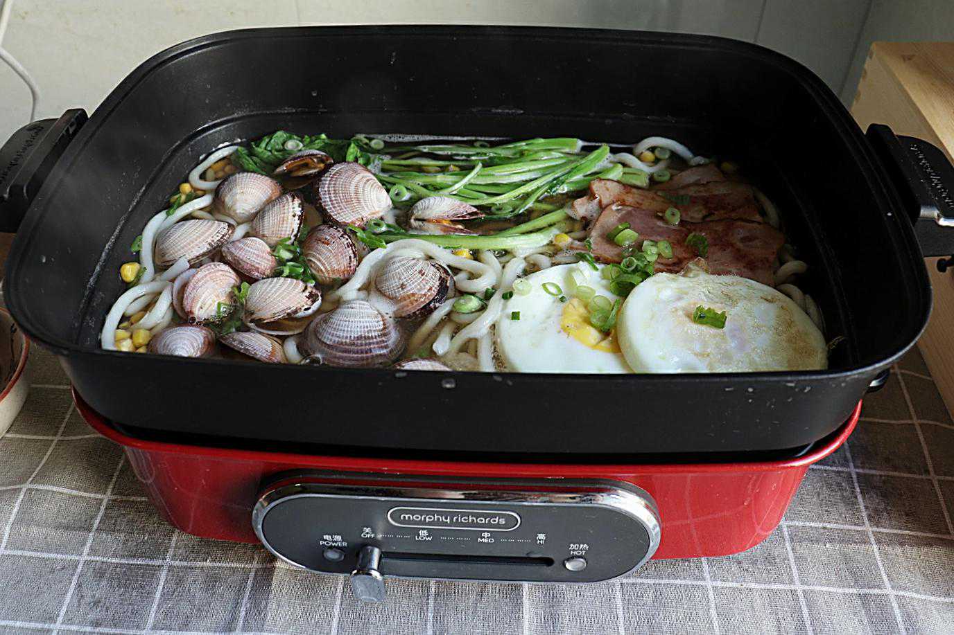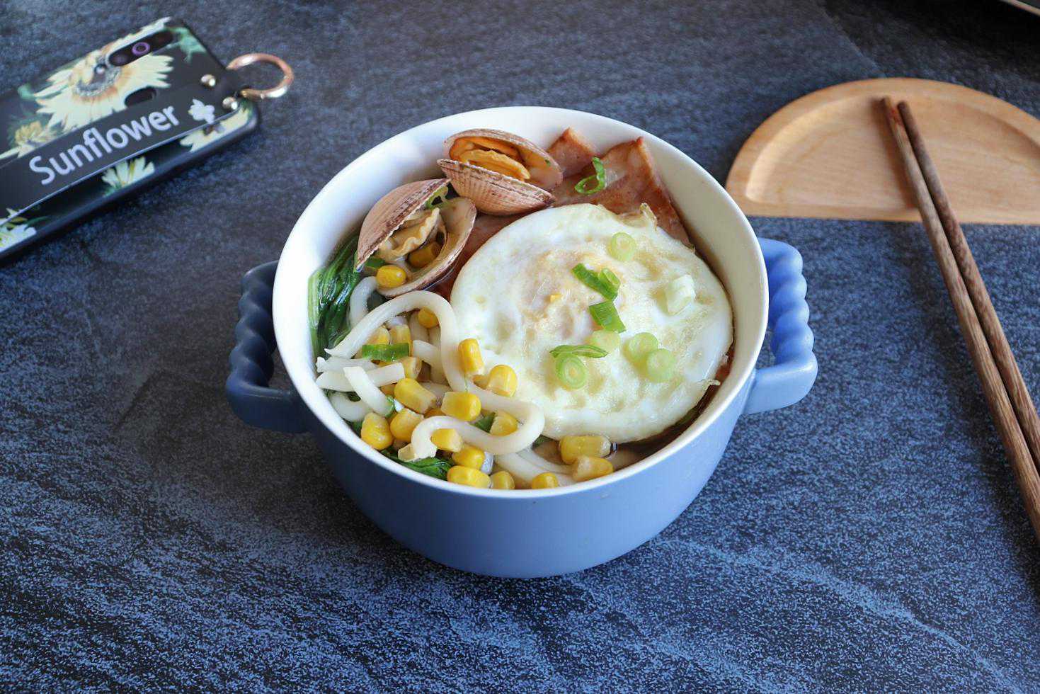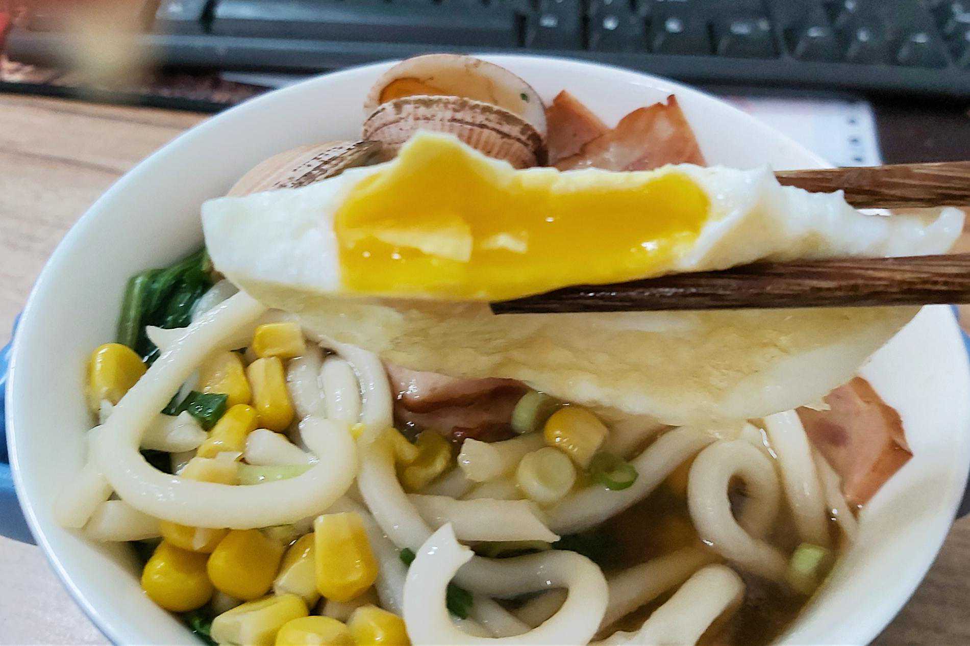 乌冬面1包,蛤蜊100克,甜玉米粒50克,青菜50克,鸡蛋2个,培根2片,盐适量,生抽2勺小,葱1根,姜片3片,玉米油少许。